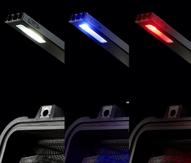 - 3 LED colours: White, Red, Blue.